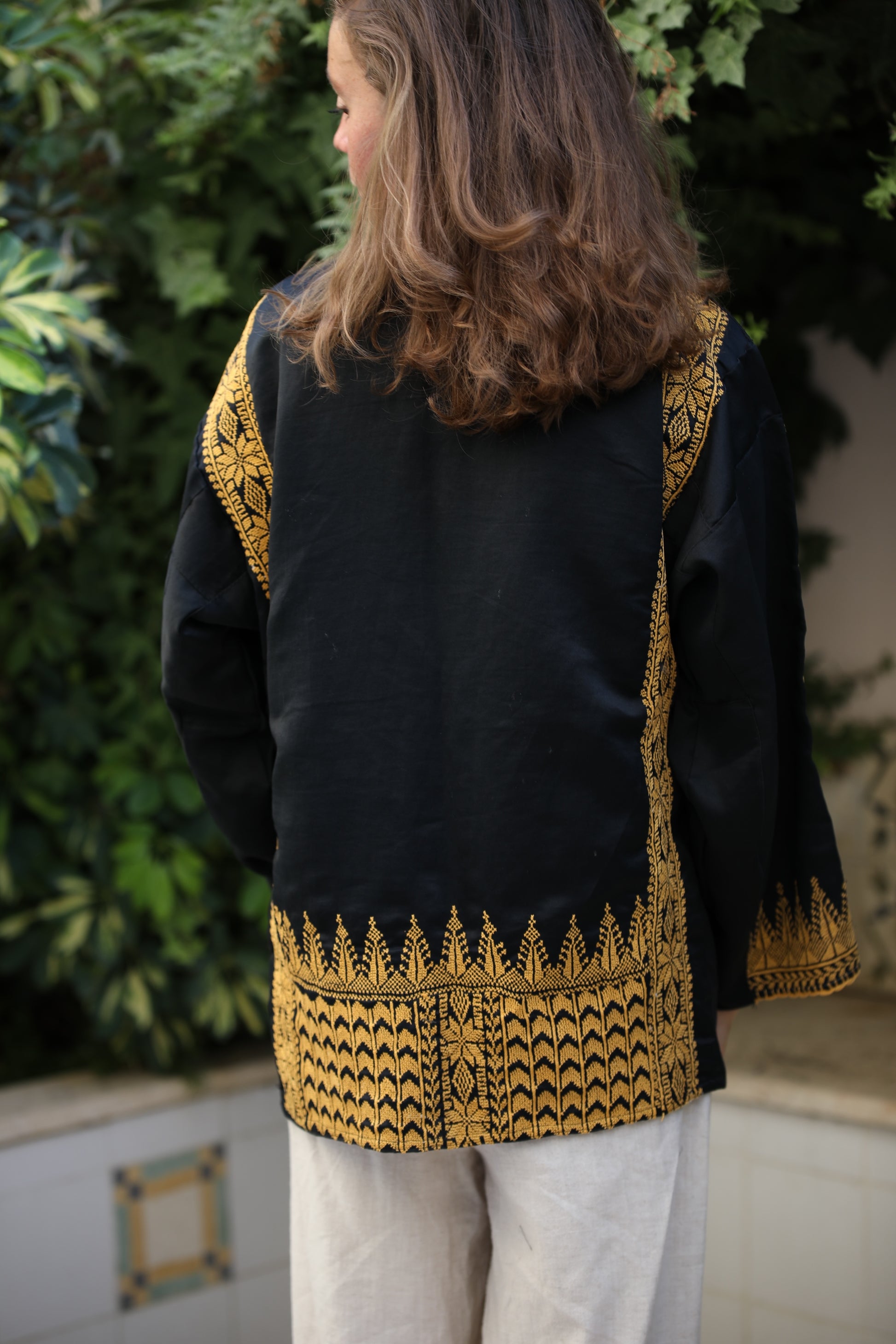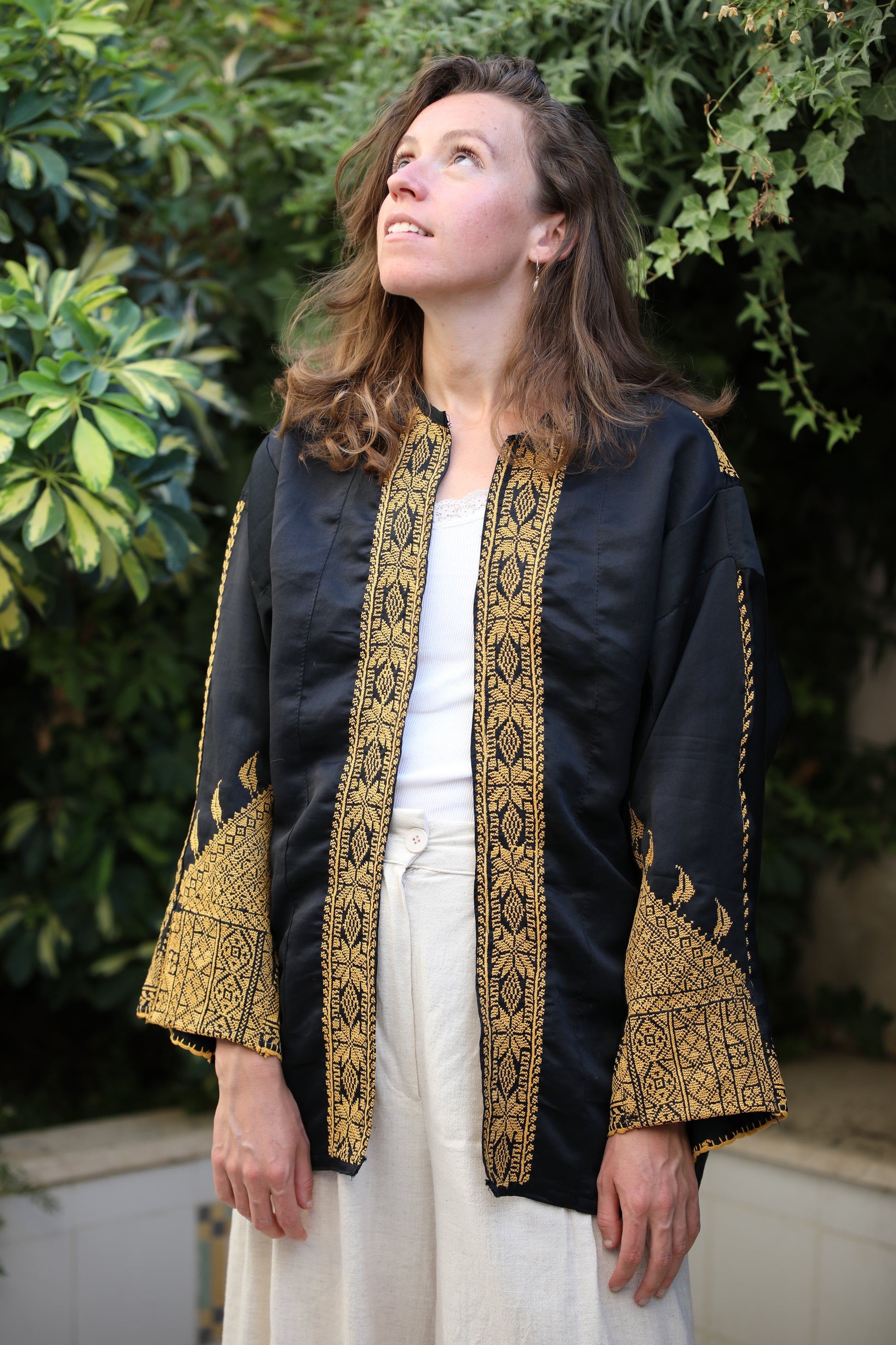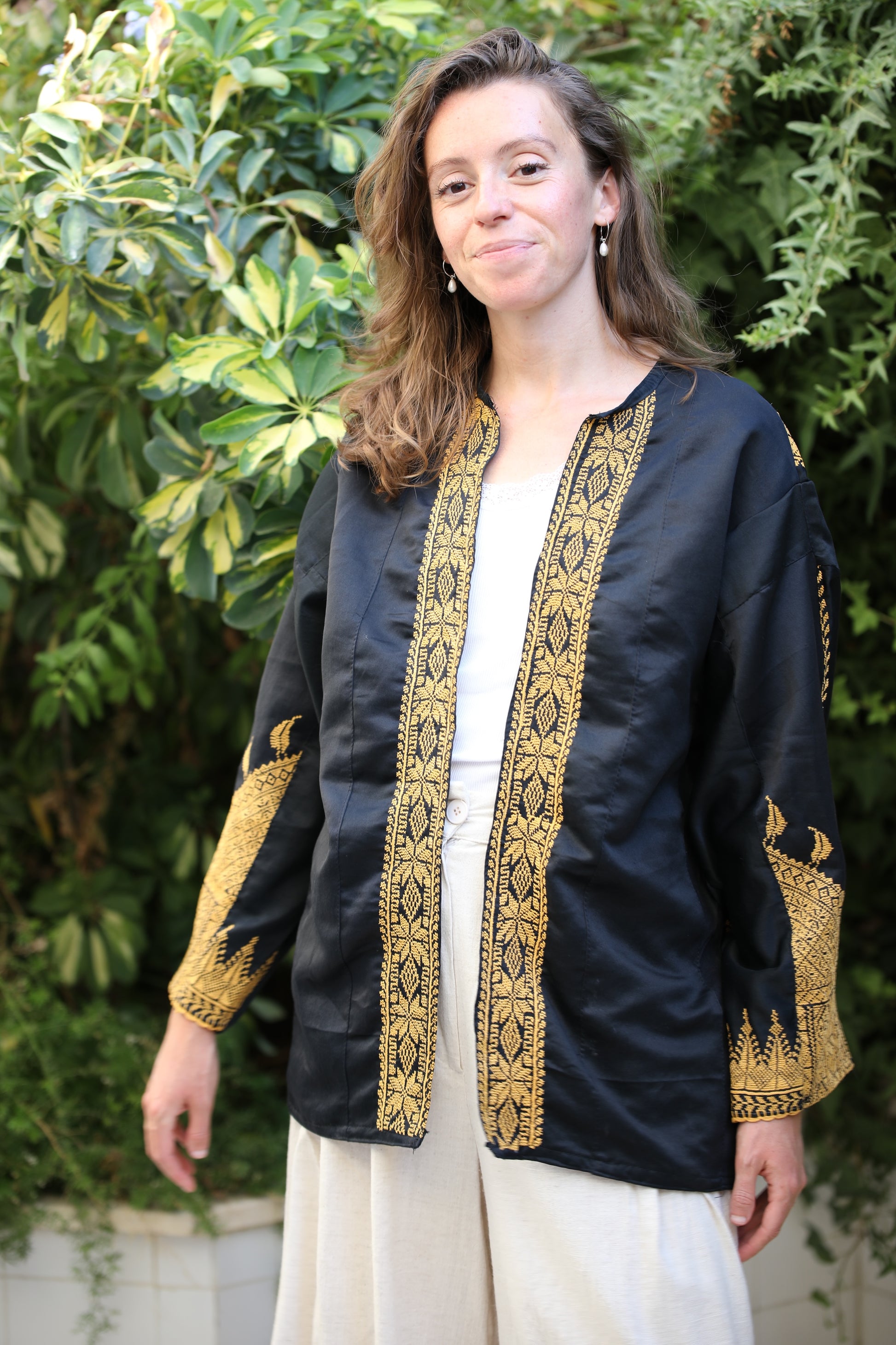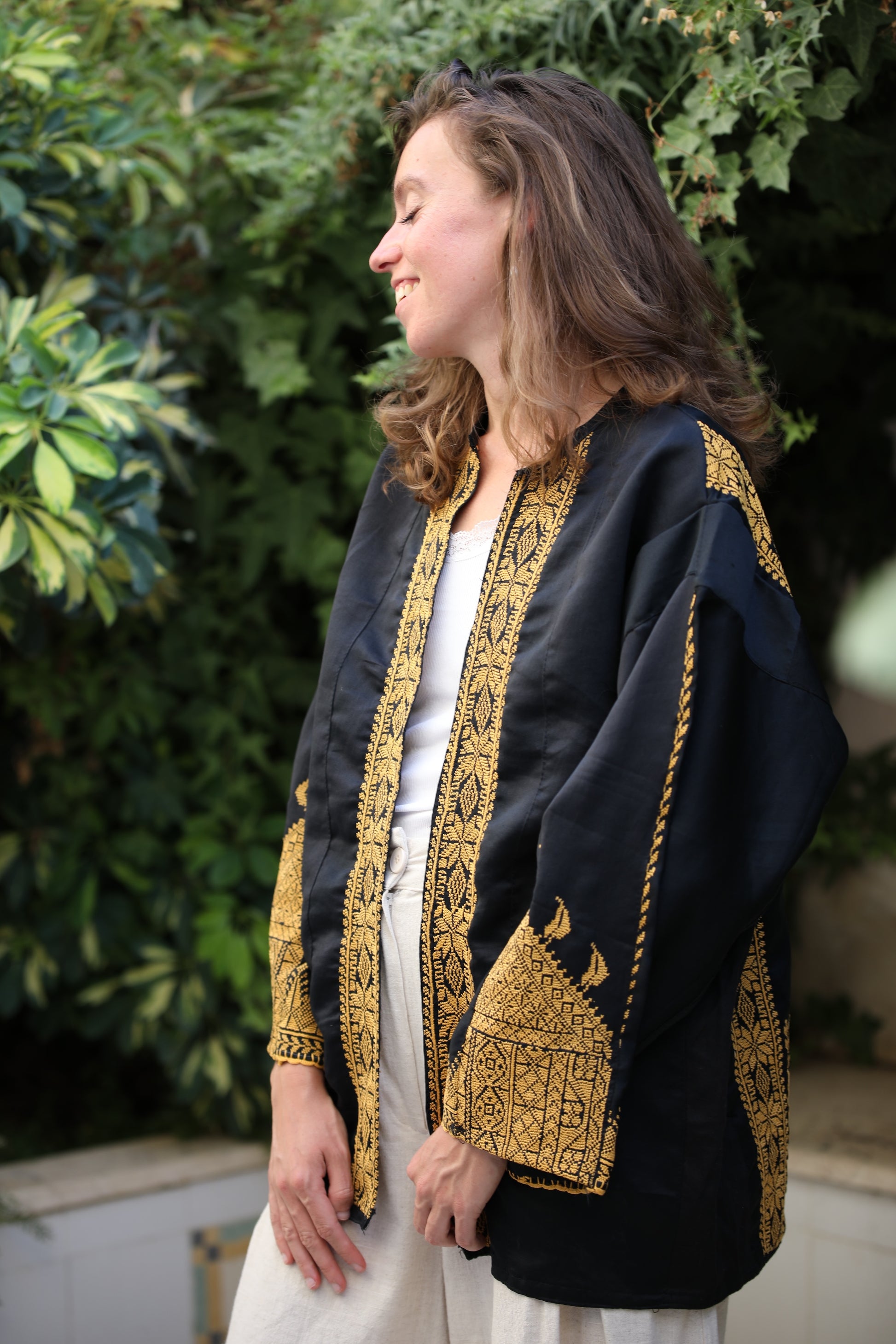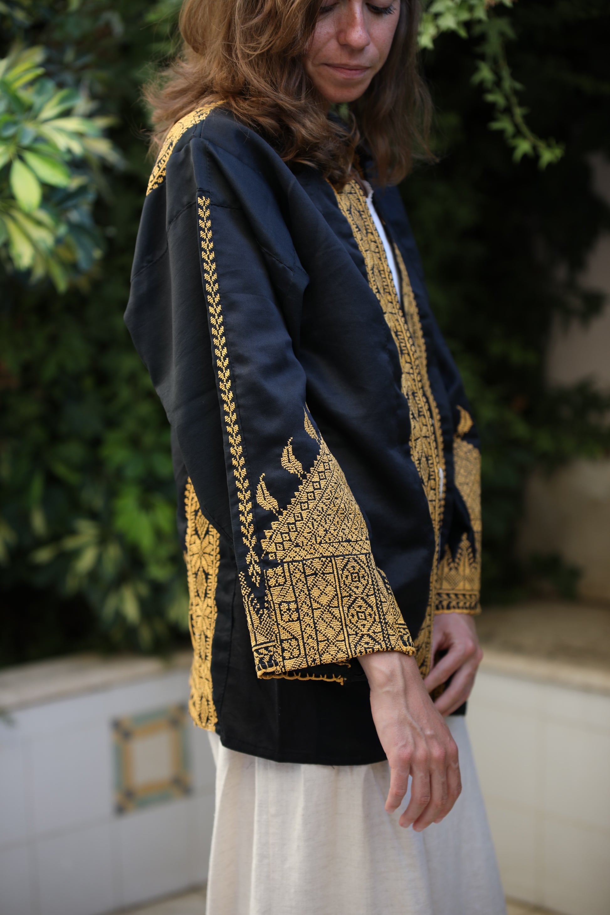 This blazer is repurposed from a vintage Thobe originally from the Hebron region.