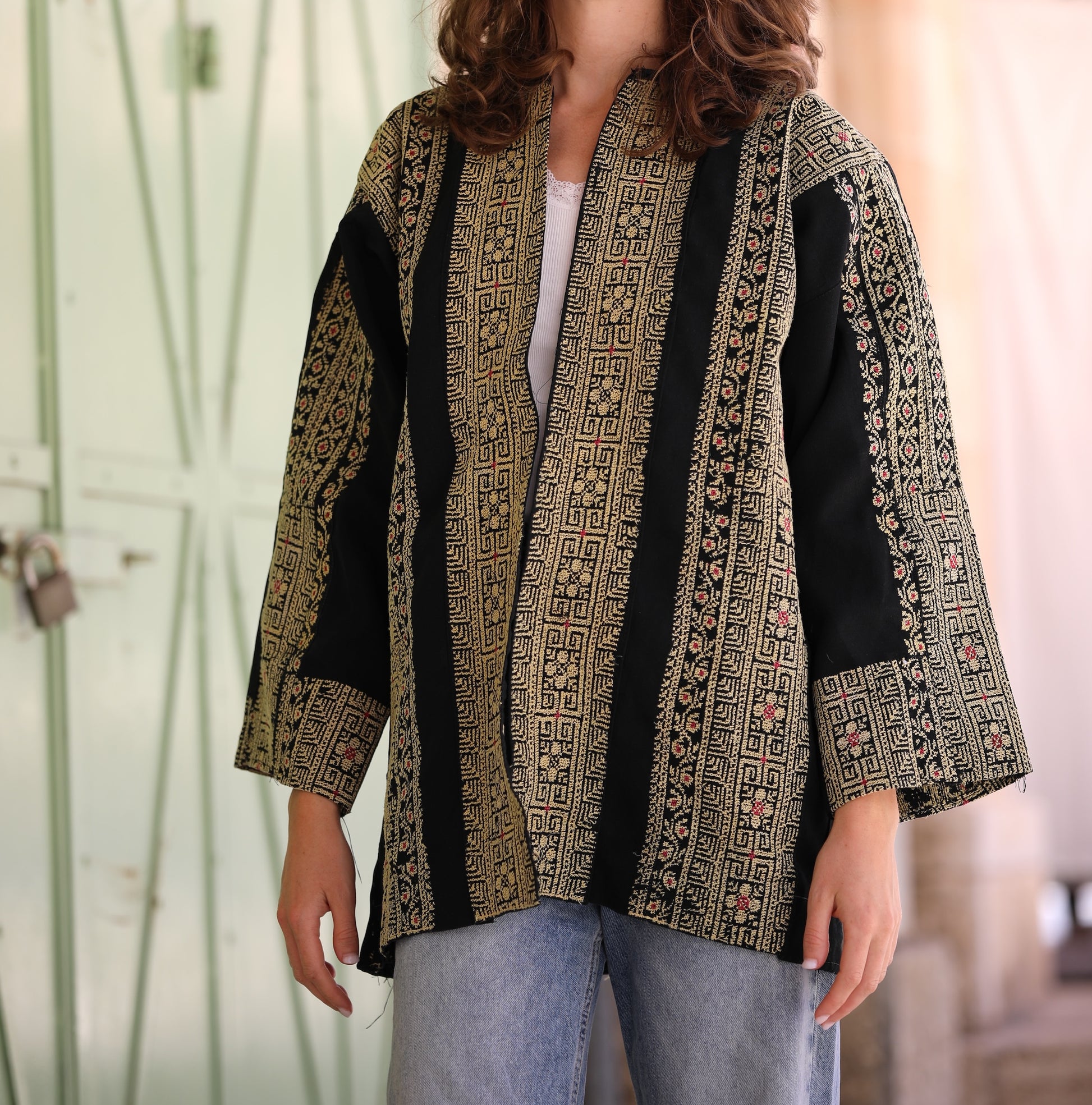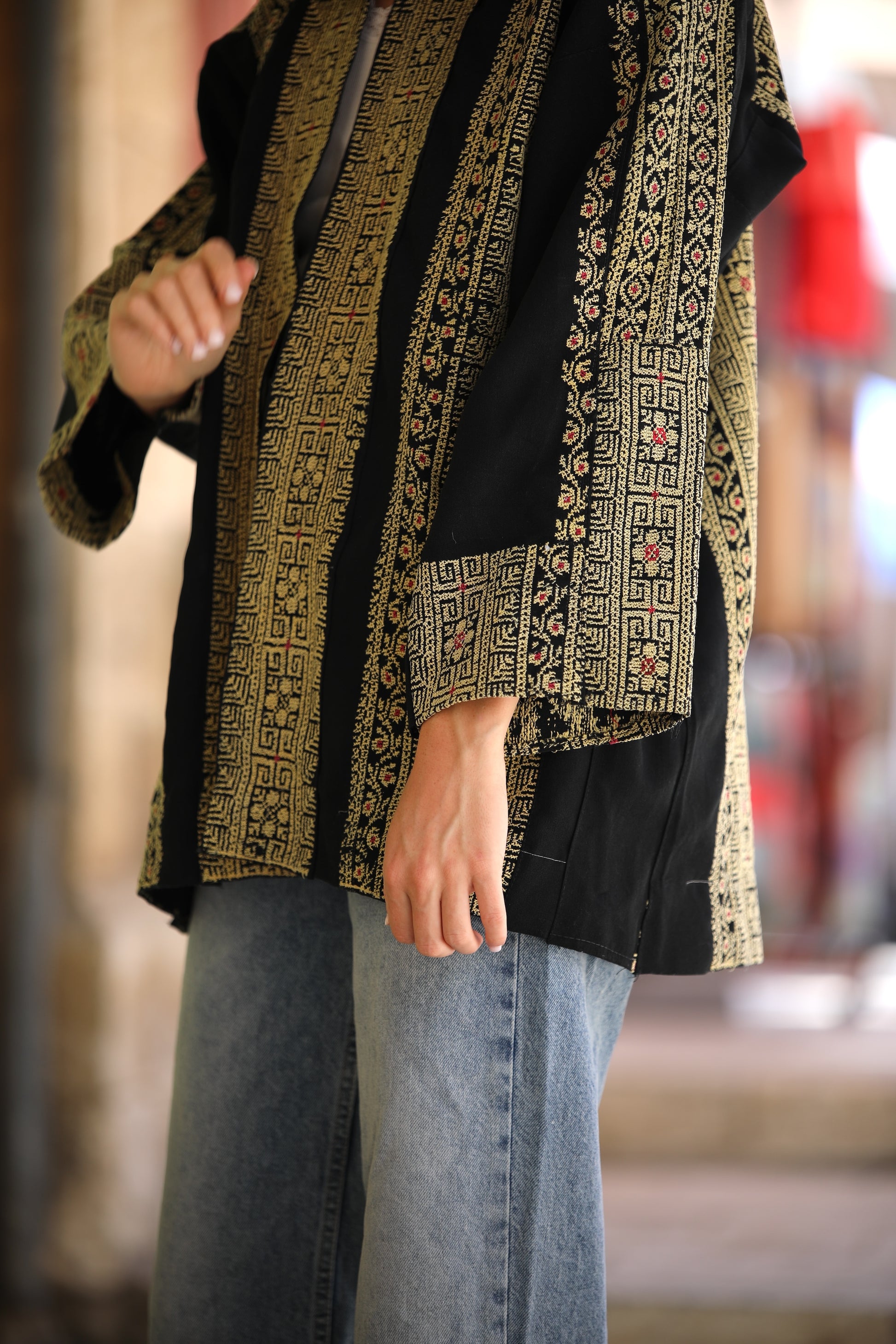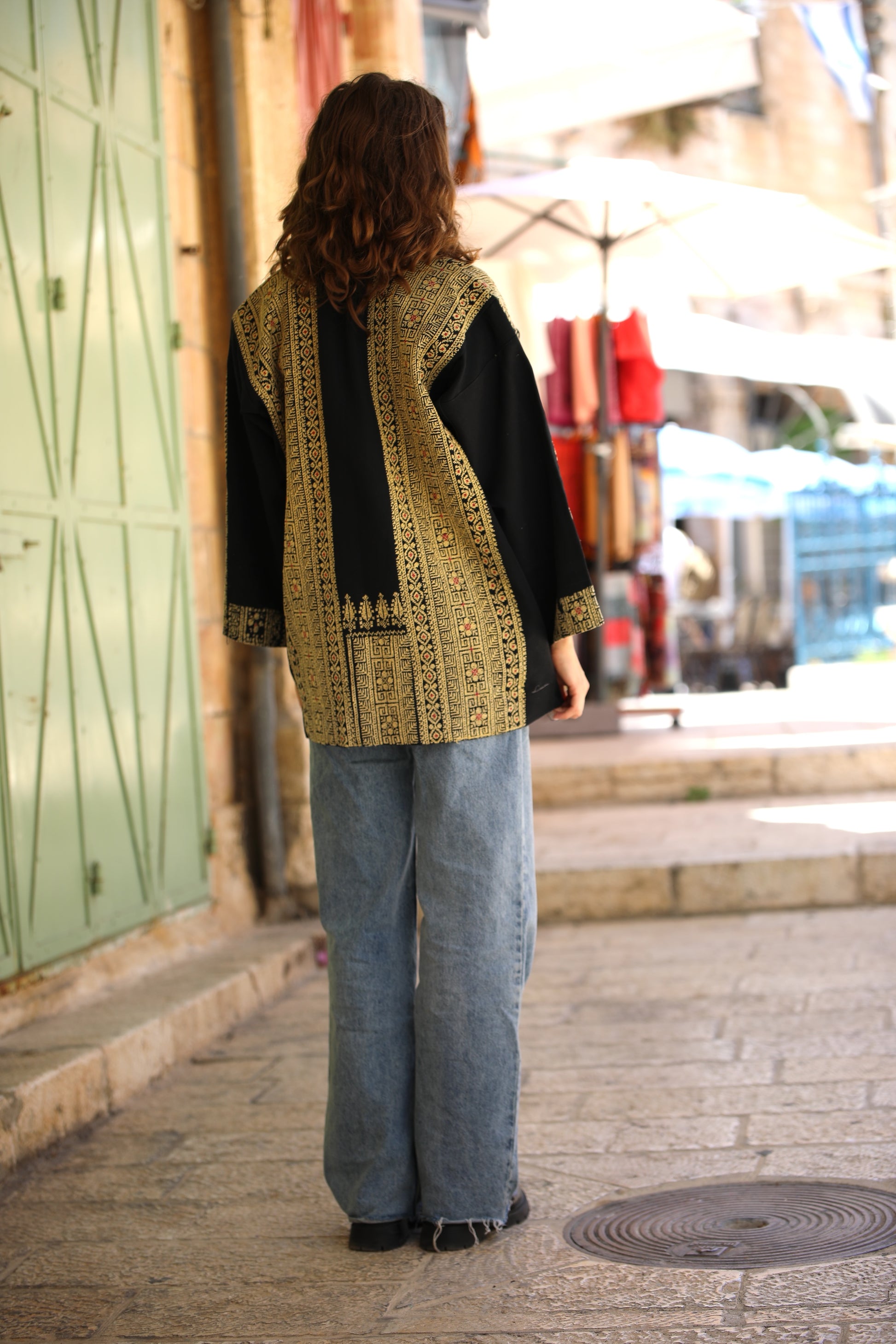 This blazer is repurposed from a vintage Thobe originally from the Hebron region.