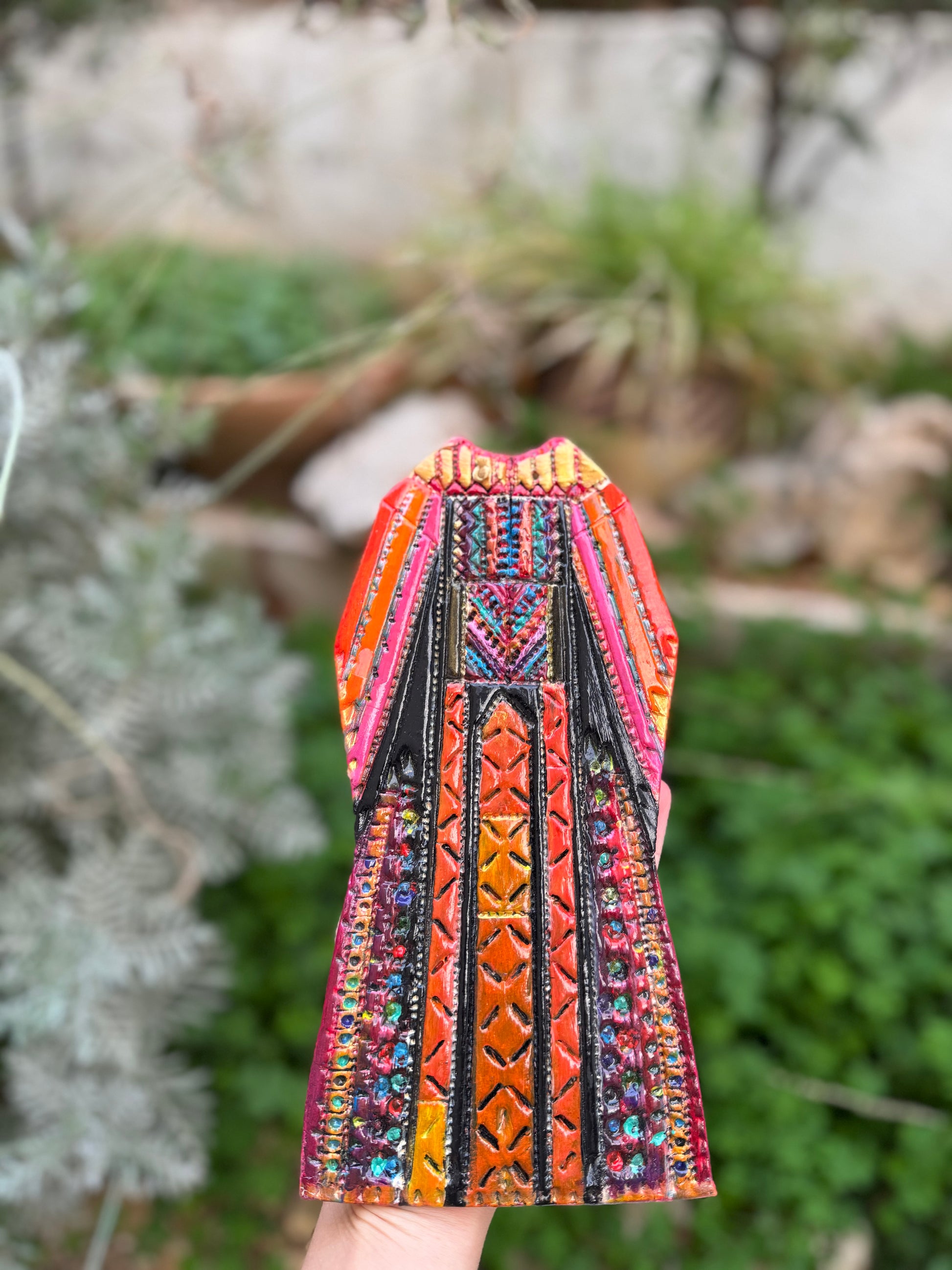 A handmade clay Thobe modeled after the original Hebron Tatreez dress. Perfect as a home décor piece, it adds a meaningful cultural accent to a space.