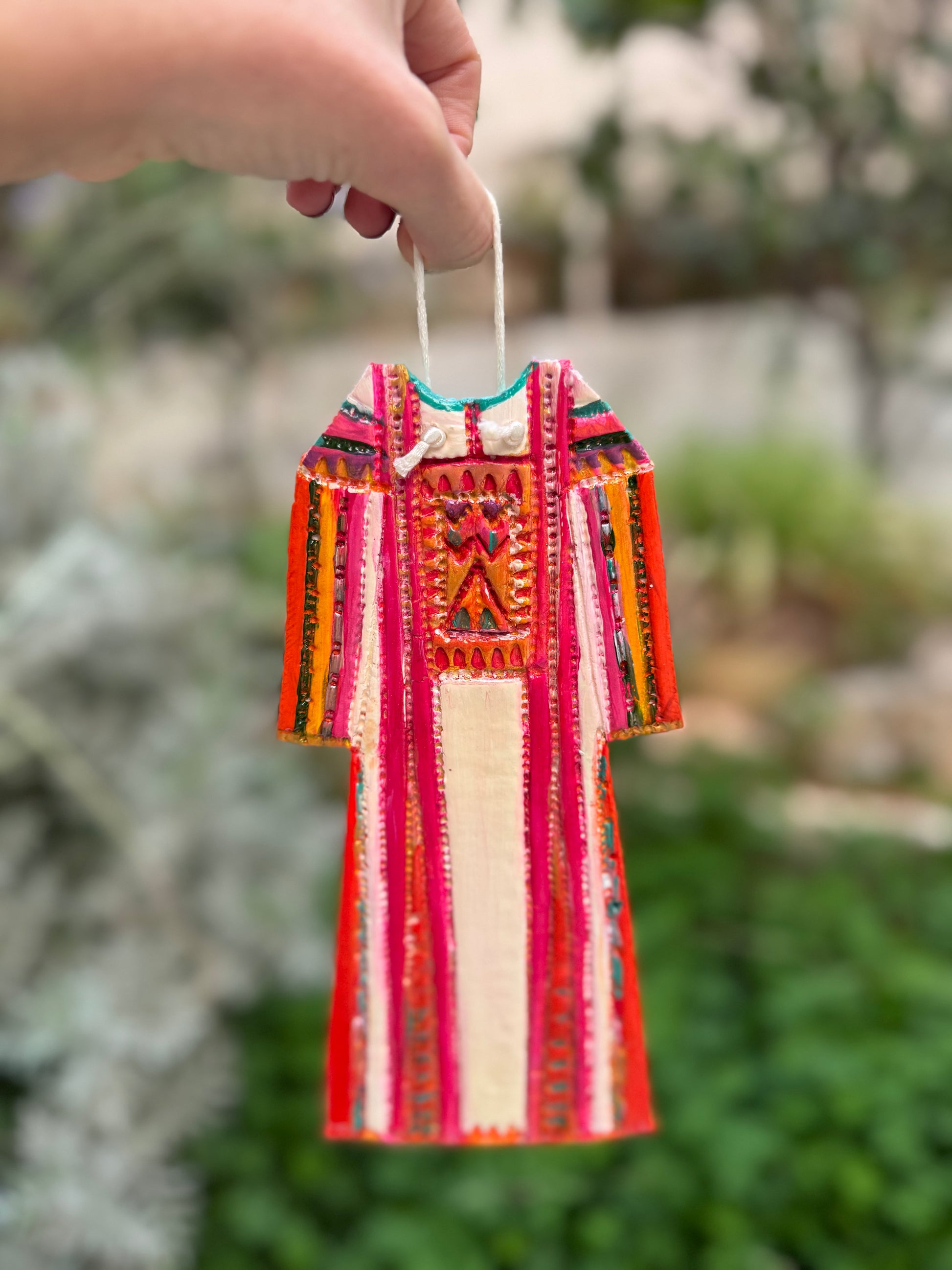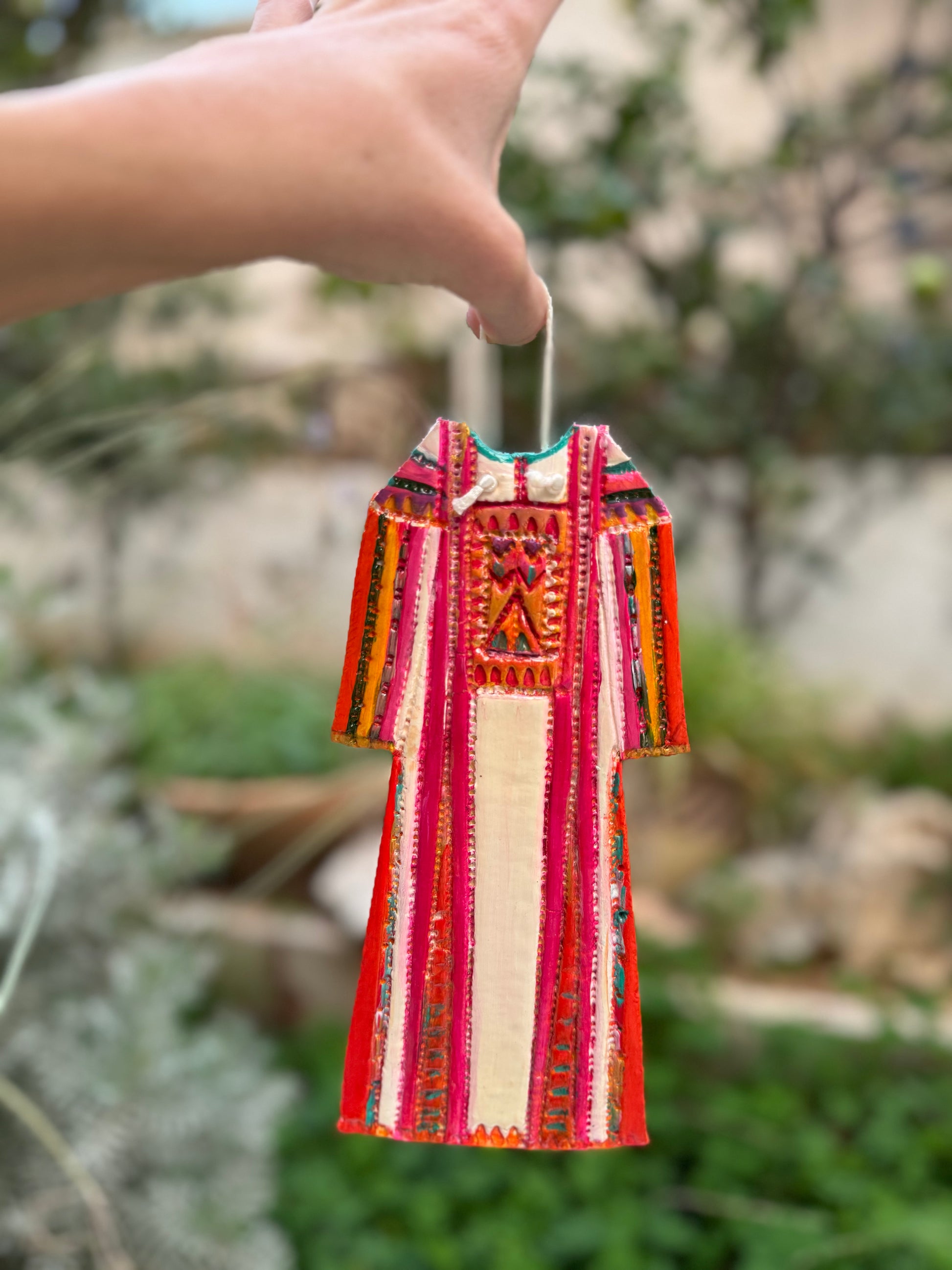 A handmade clay Thobe modeled after the original Tubsi Tatreez dress. Perfect as a home décor piece, it adds a meaningful cultural accent to a space.