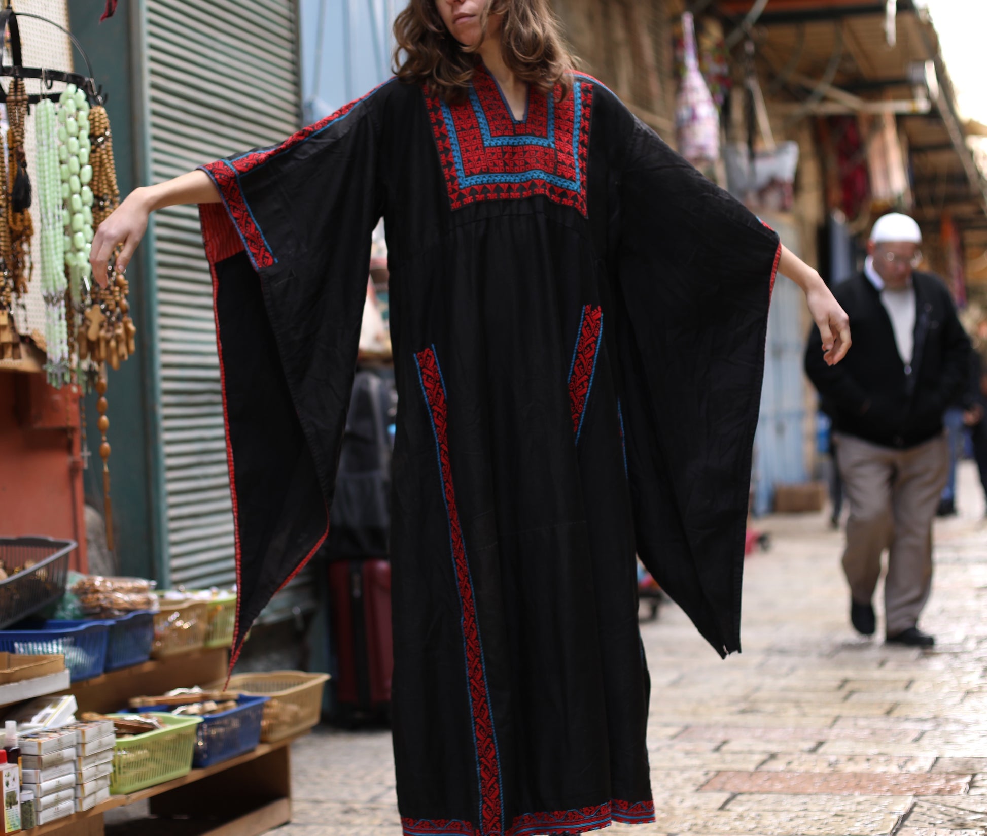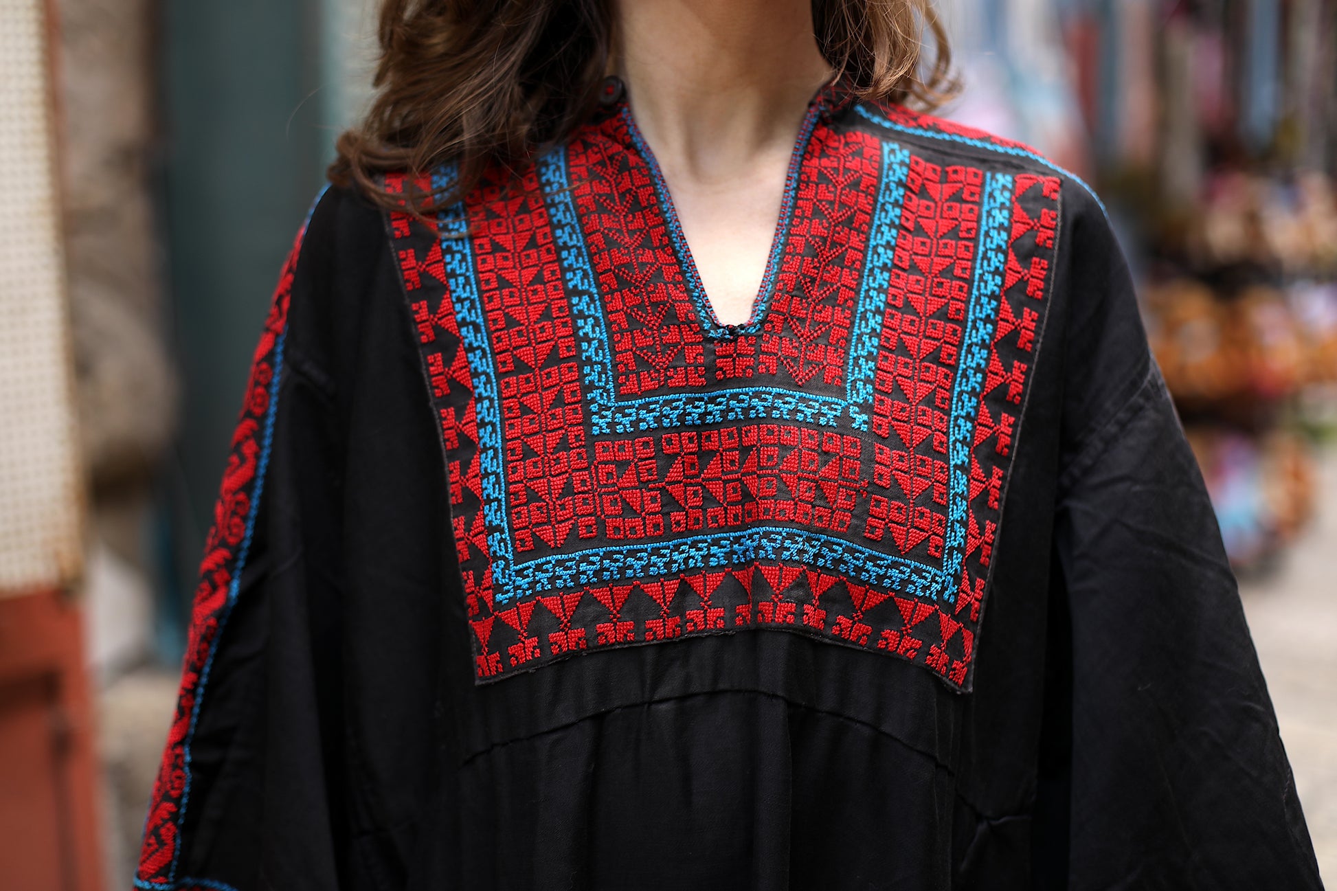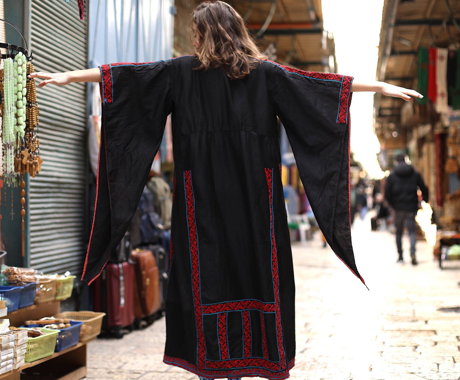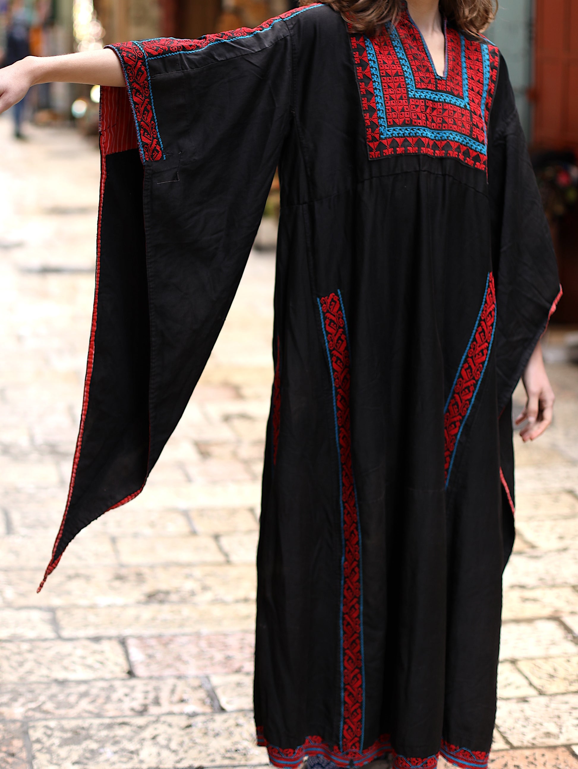 This particular Thobe originates from the Beer El-Sabe' in the Naqab desert, worn by Bedouin women. This Thobe has distinctive long, wing-like sleeves referred to as Bardan. These sleeves were traditionally tied at the back while working to allow easier movement. They could also serve practical purposes, such as carrying a child, holding small items while running errands, or even covering the face modestly in public.