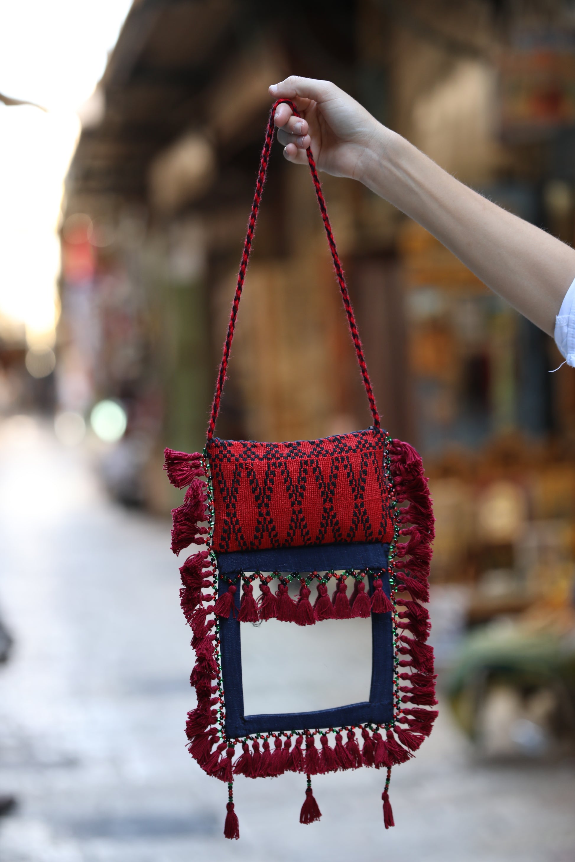 The upper portion originally held glass bottles for Kohl and perfume. It is delicately embroidered with handmade Tatreez.