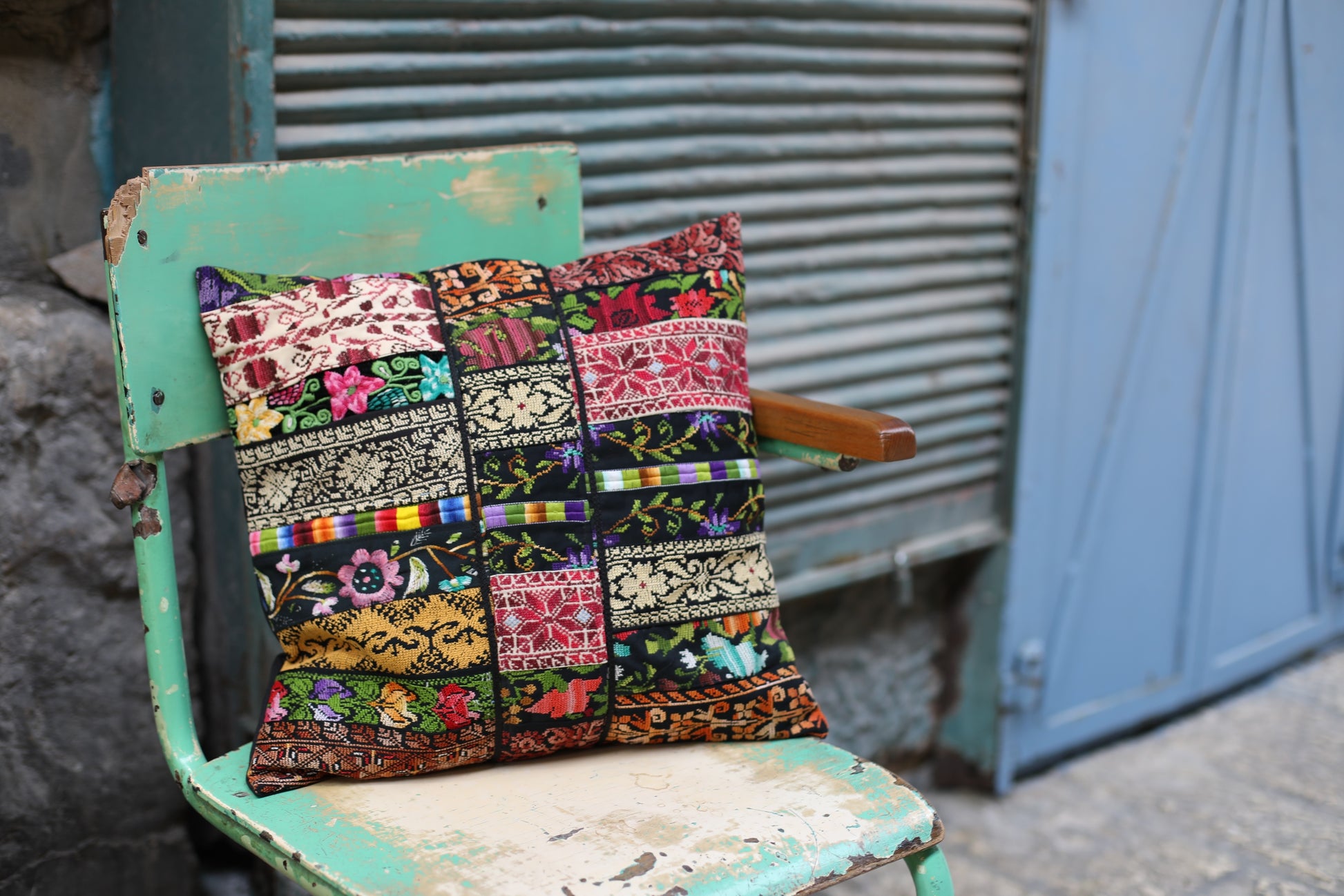 Handmade cushion cover made out of Tatreez patches sourced from vintage embroidered Thobes (Palestinian traditional dress). Each cushion cover carries a distinct symbol from the region the original dress comes from.