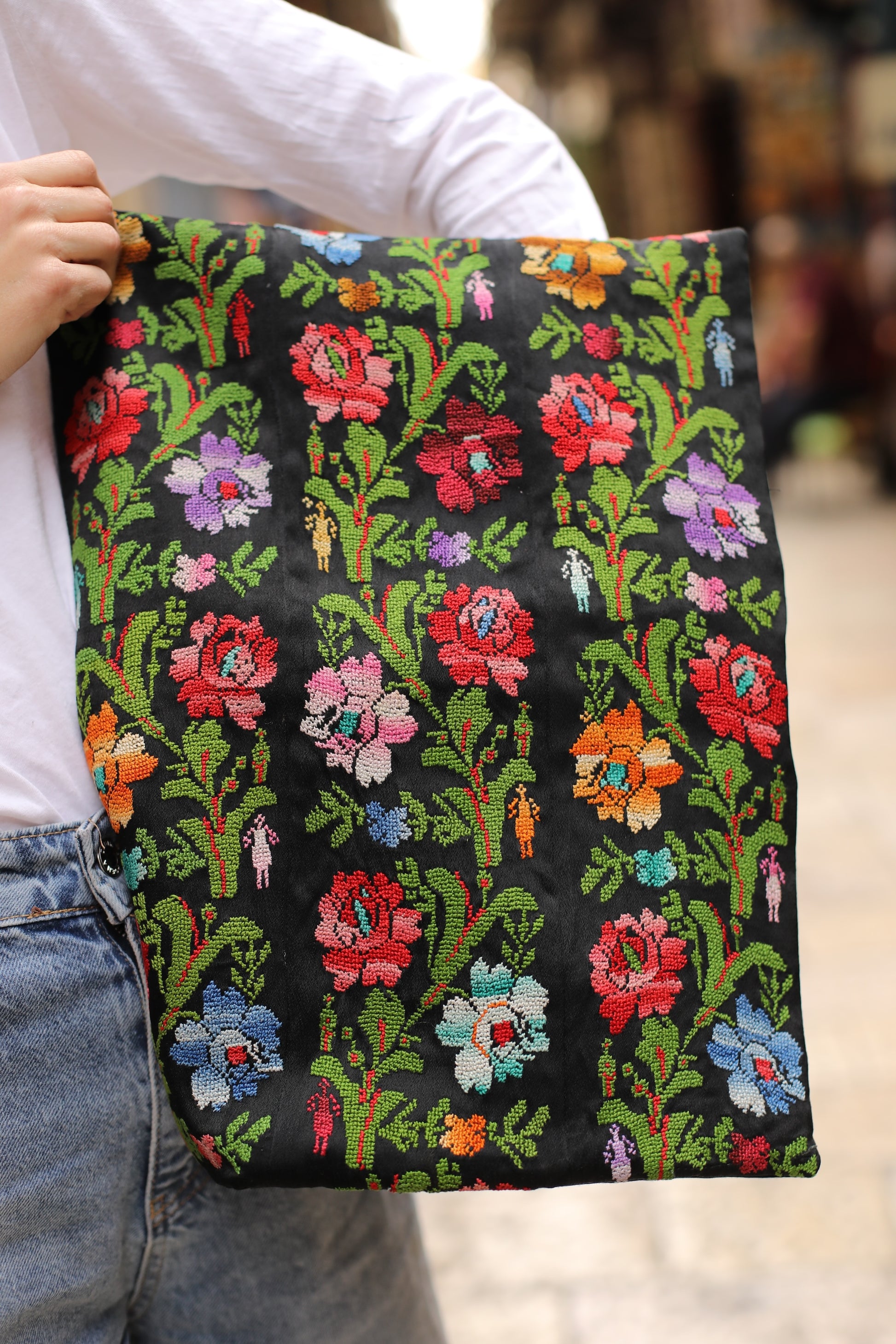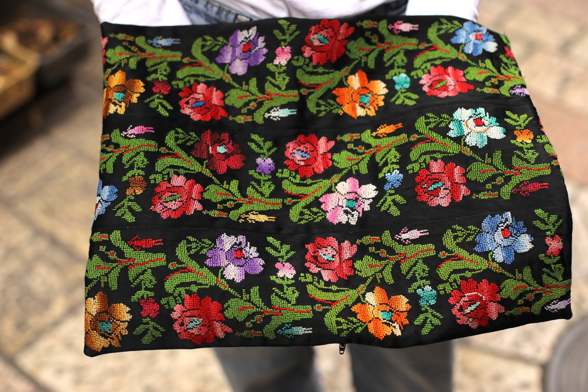 Handmade Tatreez cushion cover repurposed from a vintage embroidered Thobe (Palestinian traditional dress).