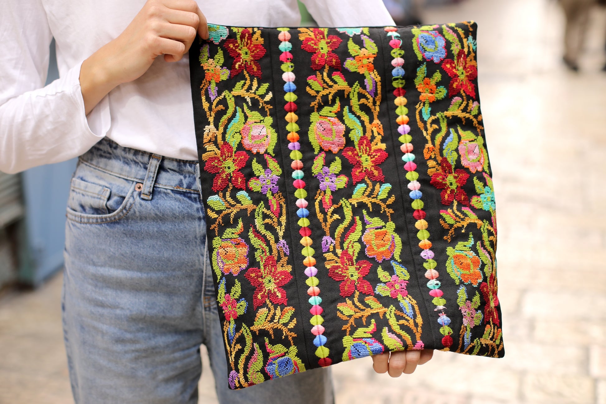 Handmade Tatreez cushion cover repurposed from a vintage embroidered Thobe (Palestinian traditional dress).