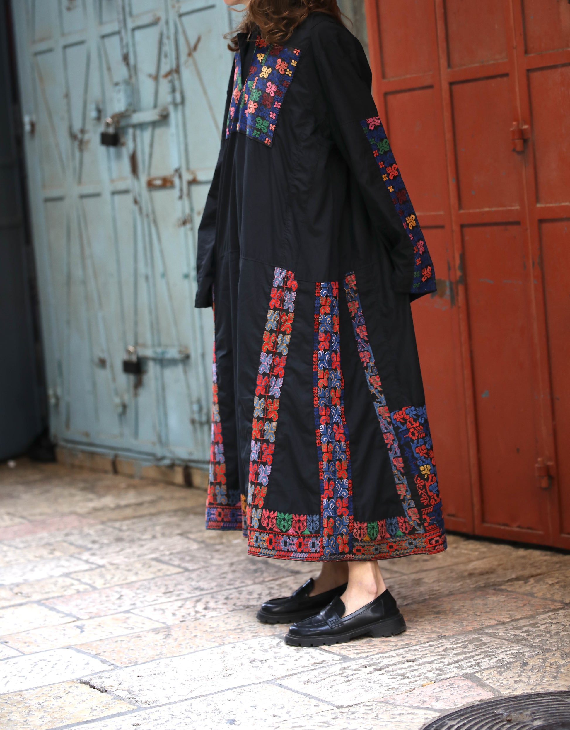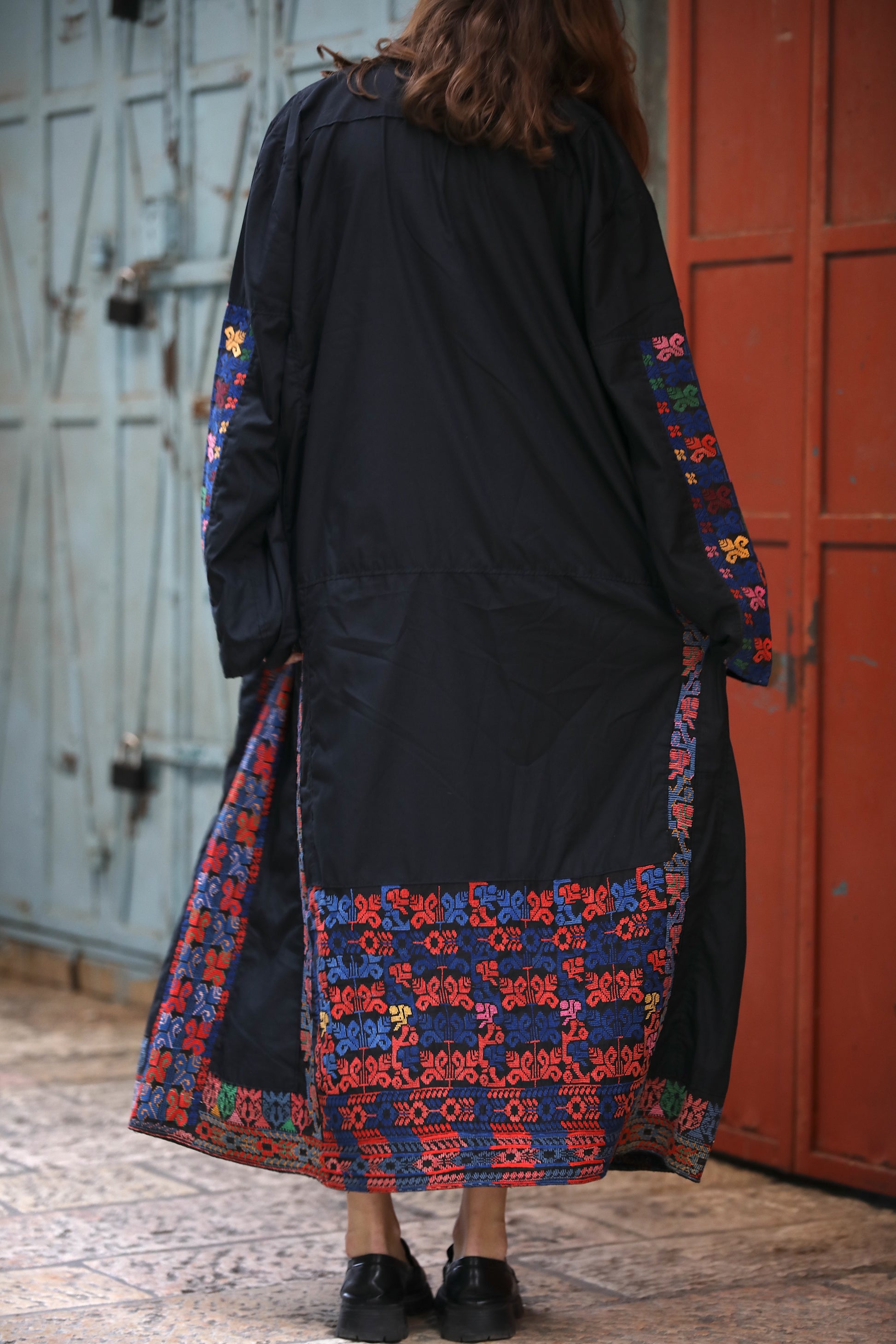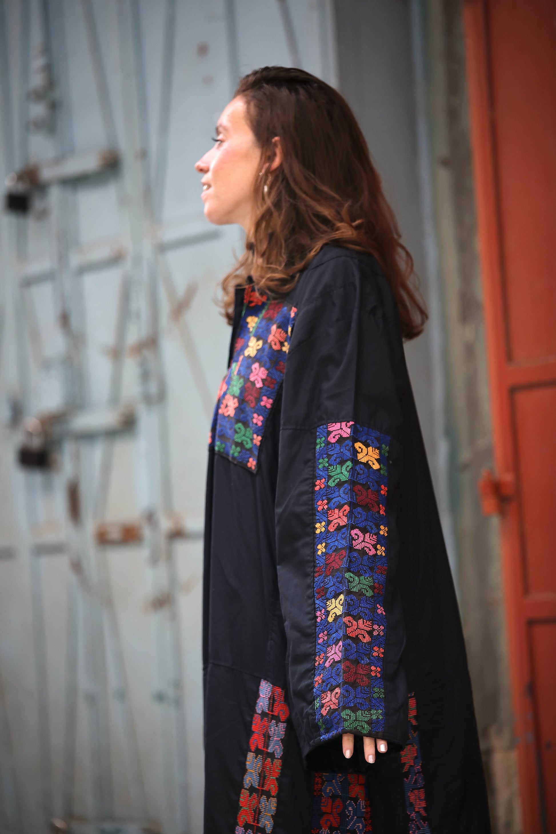 This Thobe is reassembled using original Tatreez pieces carefully taken from an old Thobe from the Rafah / Khan Younis region and applied to new fabric.