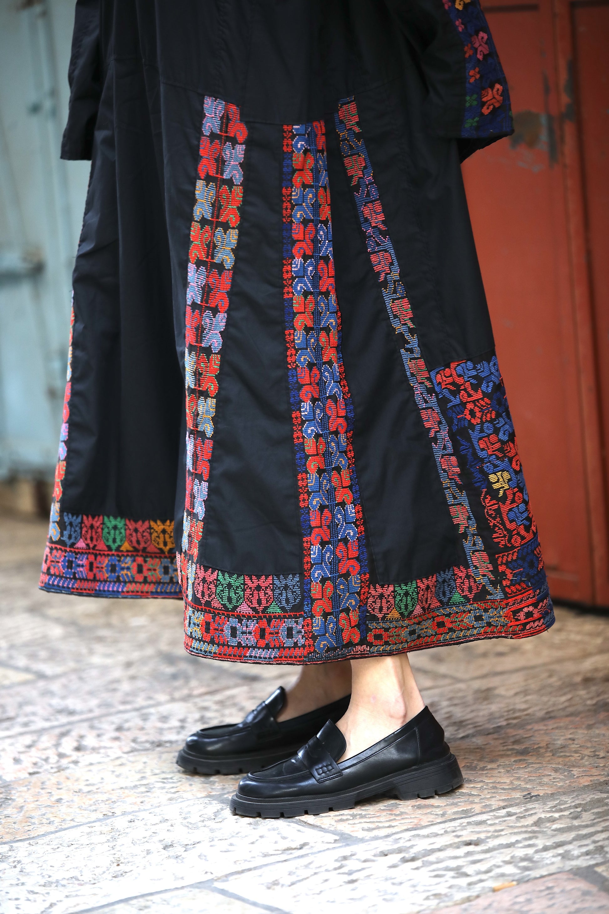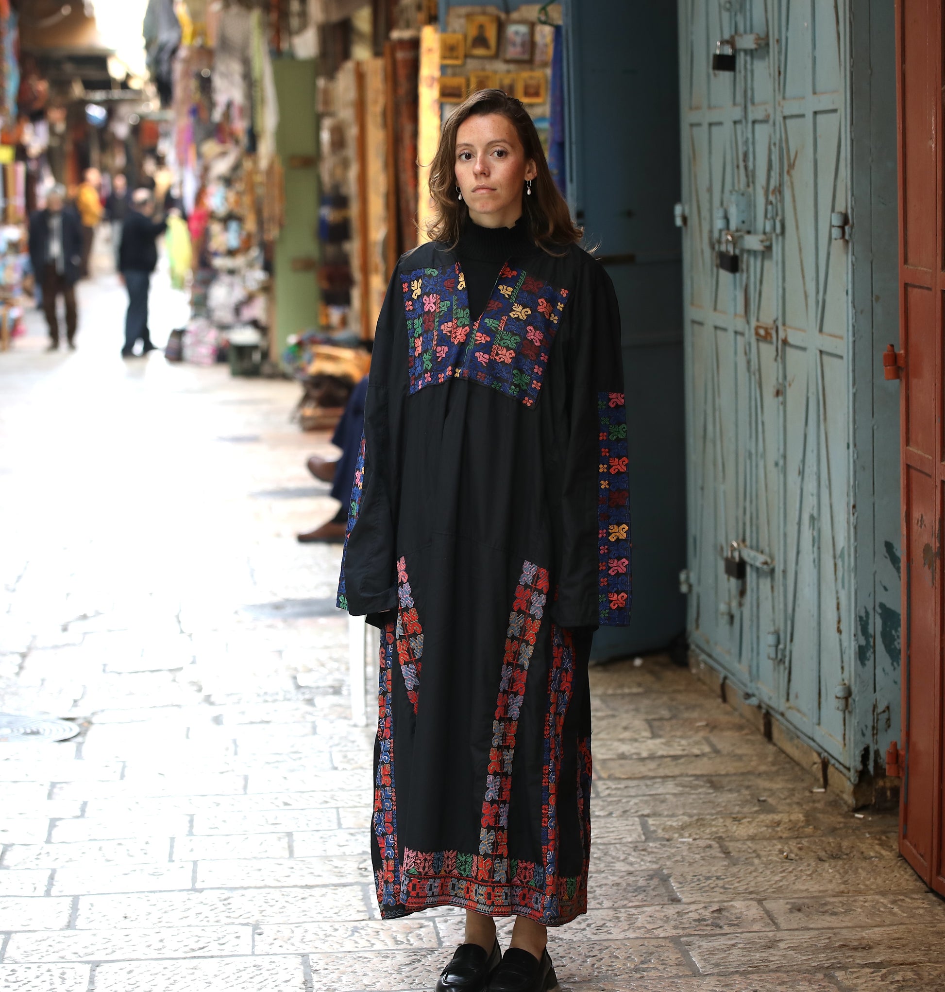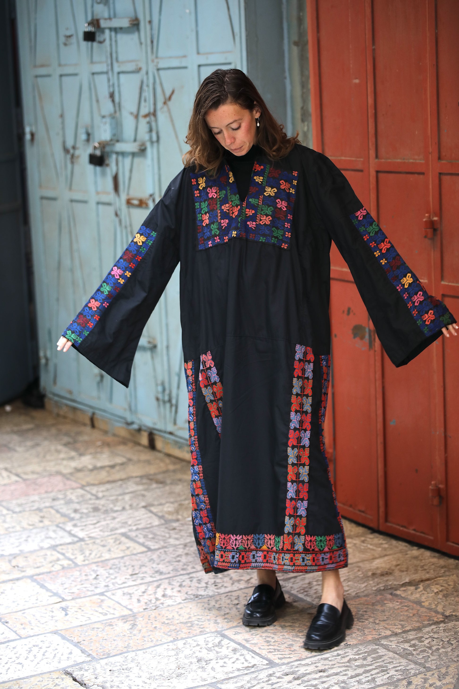 This Thobe is reassembled using original Tatreez pieces carefully taken from an old Thobe from the Rafah / Khan Younis region and applied to new fabric.