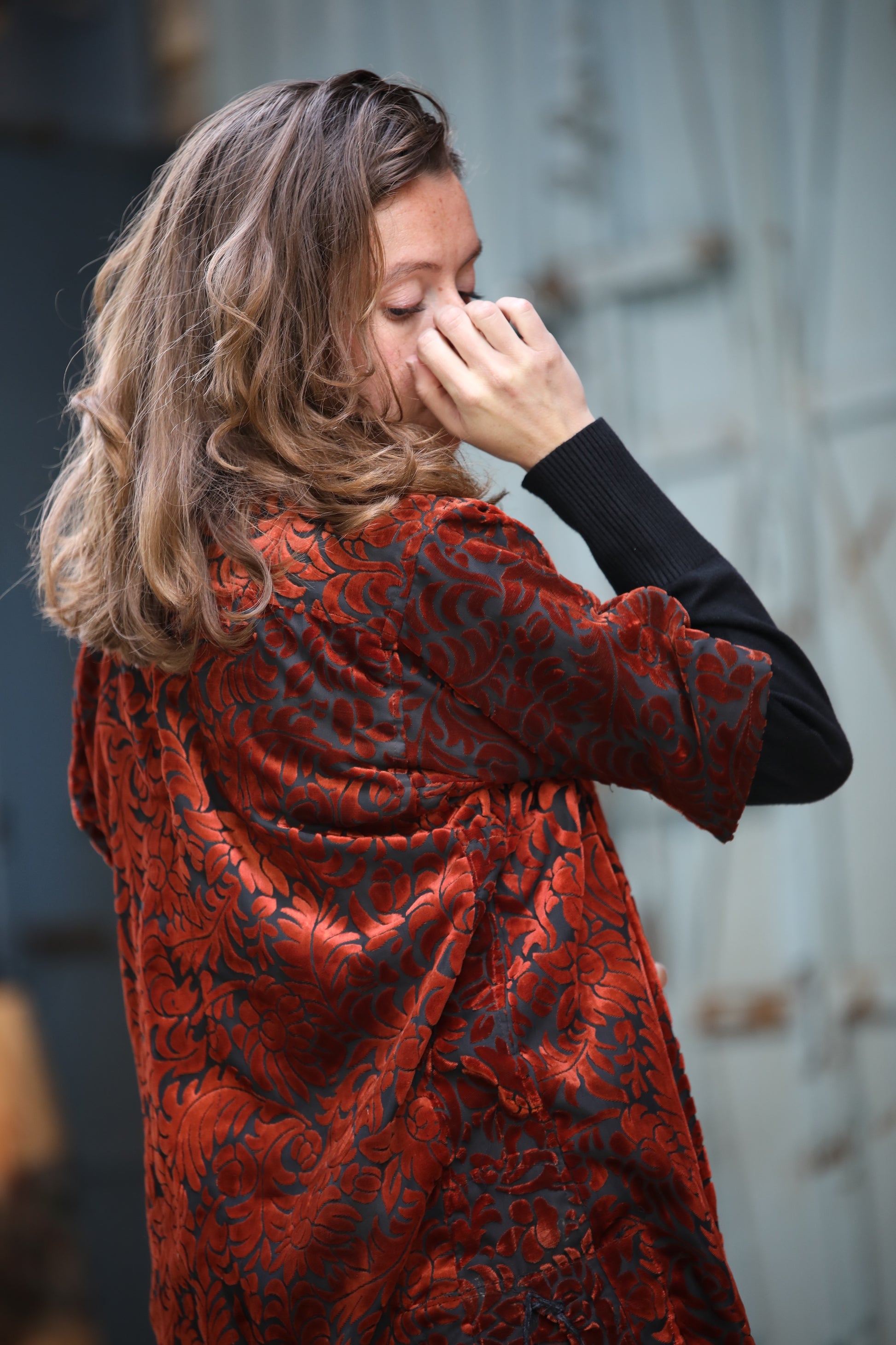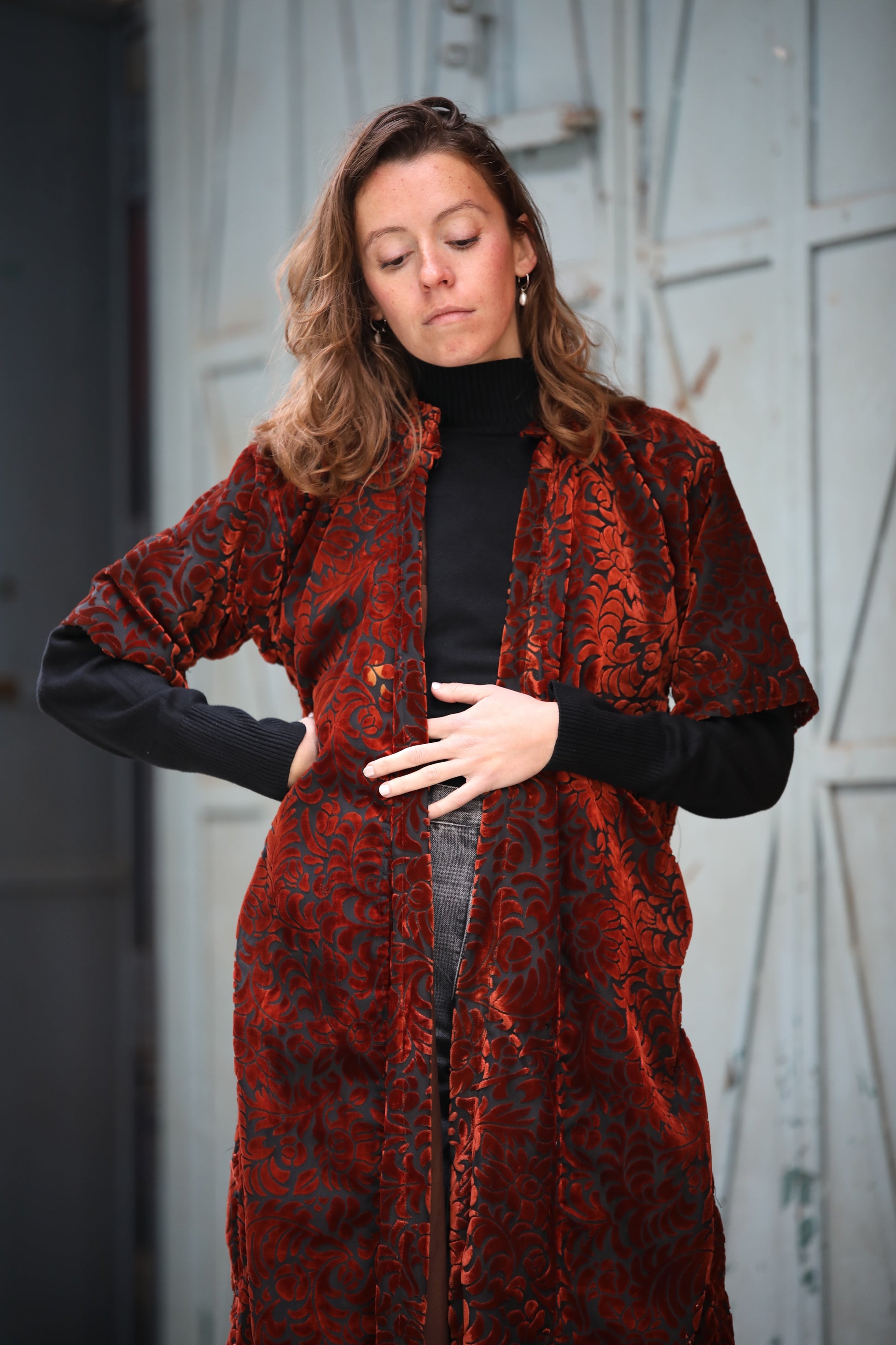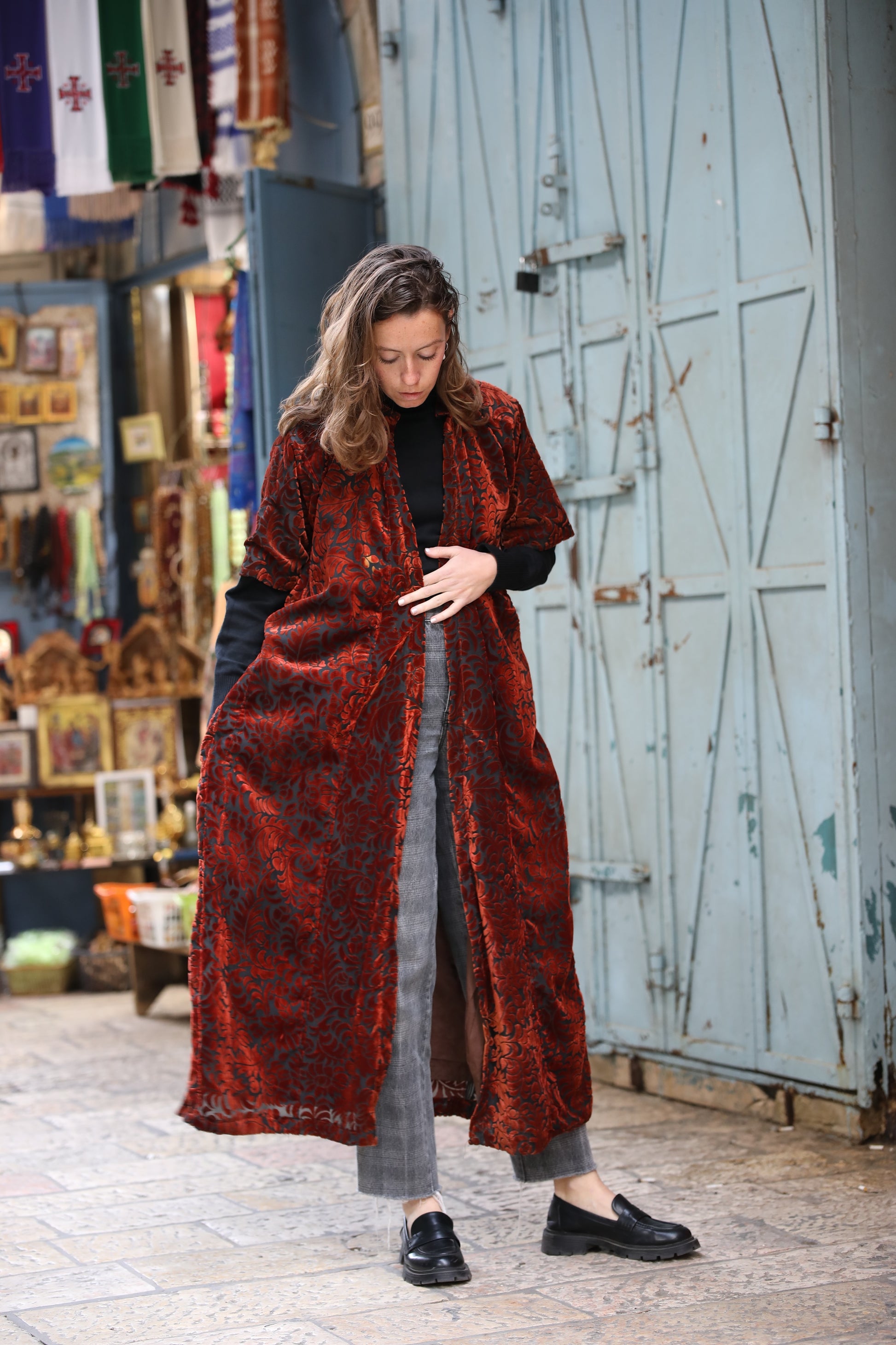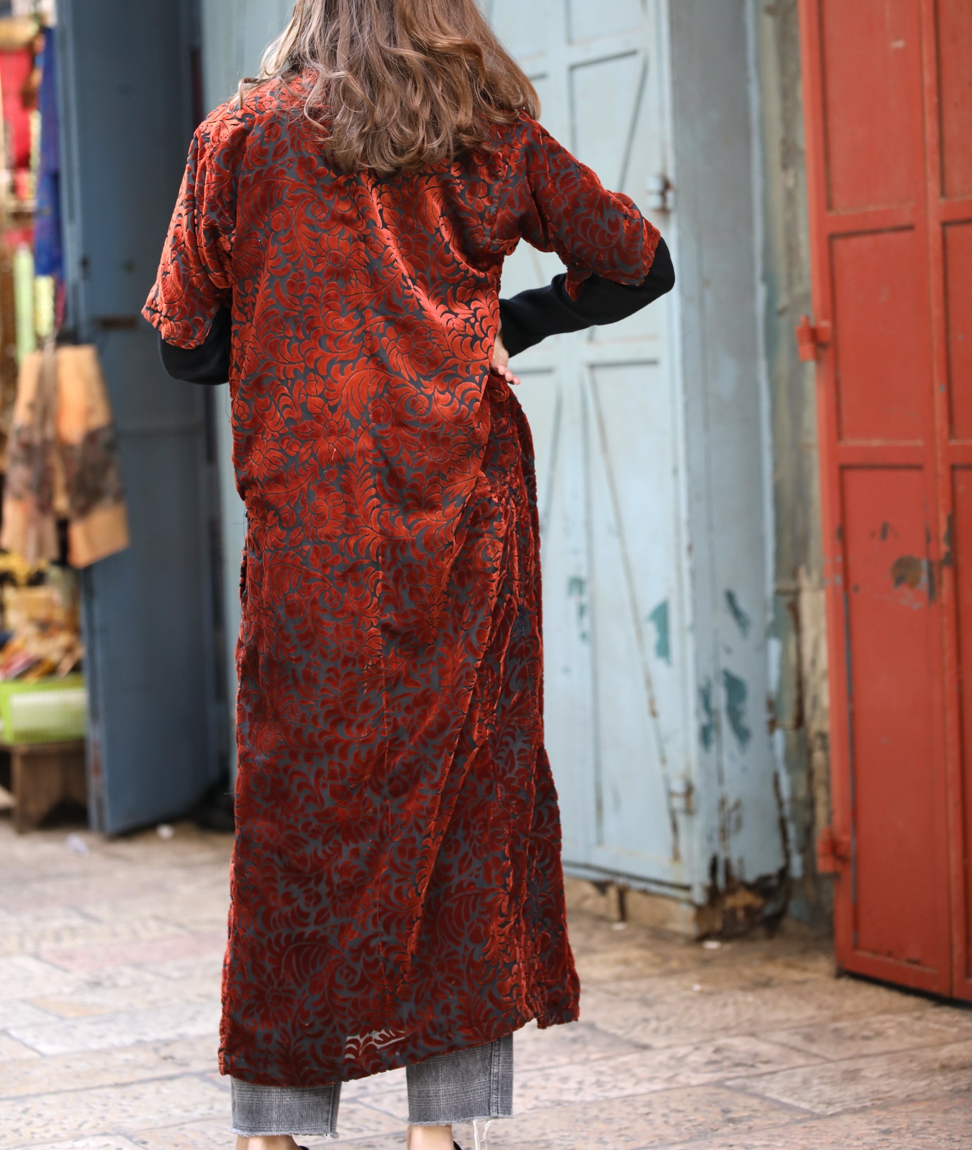 Velvet robe in patterned rust brown, traditionally worn in the Tulkarm region.